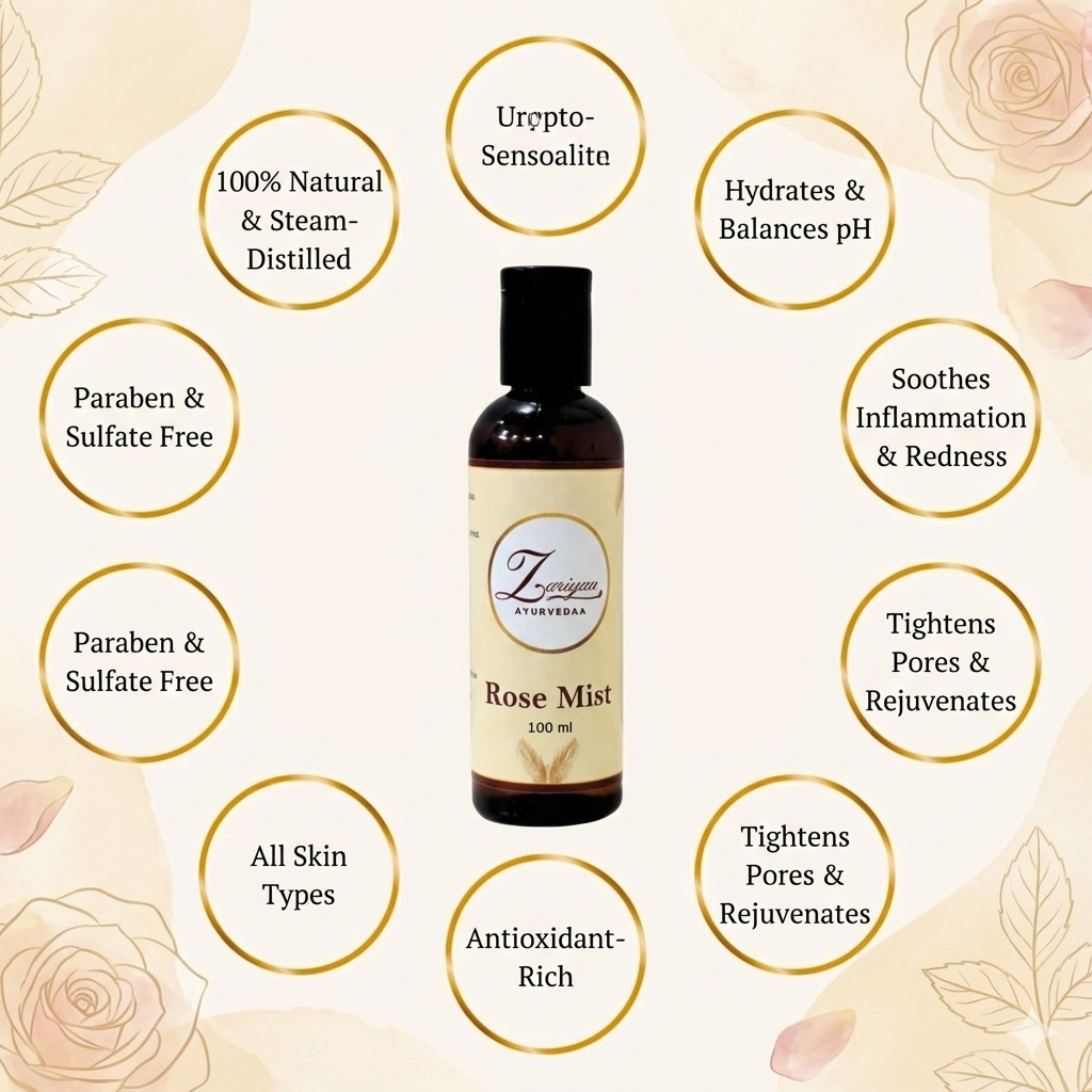 Formulated with a traditional Ayurvedic approach, our rose water mist is free from artificial fragrances and chemicals, making it ideal for sensitive and acne-prone skin. Perfect as a toner after cleansing or a refreshing spritz anytime during the day, it also serves as a natural setting spray for makeup.